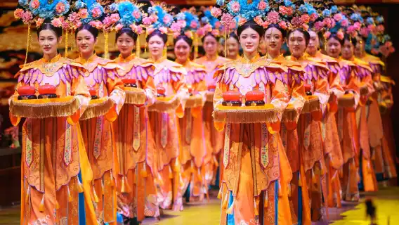 [Spettacolo teatrale] Viene messo in scena il grande spettacolo gastronomico imperiale "Banchetto Imperiale Cinese", che trasporta i clienti nell'epoca dell'imperatore Qianlong della dinastia Qing, permettendo loro di assistere ai grandiosi festeggiamenti per l'80° compleanno dell'imperatrice madre Chongqing. Durante il pasto ci sono anche esibizioni di presentazione dei piatti e sfilate, con un servizio imponente di "100 chef imperiali e 300 nobili dame", offrendo ai clienti un'esperienza dello sfarzo della corte imperiale.