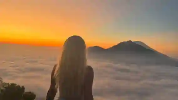 Ammira l'alba dalle nuvole sulla vetta del Monte Batur