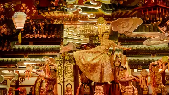 Il personale vestito con abiti tradizionali Tang si muove tra la folla, mentre si susseguono spettacoli di musica e danza mozzafiato, dalle eleganti danze con abiti di piume alle esibizioni di spada maestose, ricreando in ogni dettaglio lo splendore della dinastia Tang e trasportando i visitatori nell'atmosfera della gloriosa Chang'an.